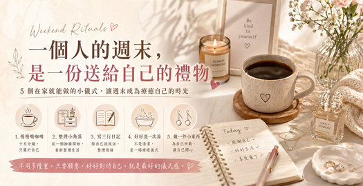 一個人的週末不用特別安排也能療癒自己。分享 5 個不花錢的小儀式,從早晨咖啡、整理抽屜到寫三行日記,讓你在獨處時光裡,重新找回好好對待自己的節奏。
